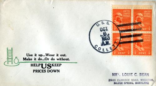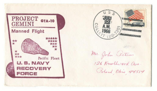 Here is a First Day Cover mailed off Collett on July 22, 1966. This would have been about two months after we left Long Beach for WestPac. The cover celebrates the participation of Collett in Project Gemini Recovery Operations in the Pacific Fleet. I do not know the addressee, but I am sure someone out there does. I bought this item off e-Bay about 5 years ago.