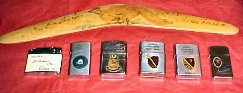 From left to right they are: Shitkicker Bar lighter, Windjammer Club lighter, HMAS Hobart lighter, Collett Asiatic Squadron '66-'68 lighter, Collett Asiatic Squadron '62-'64 lighter, and finally a USS Chicago CG-11 ship's lighter.