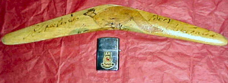 This was given to me by a sailor off the Hobart named Bill Stewart. He also gave me the boomerang you will see in a later picture and can see some of in this one. We had a swap of personnel while on station in the Gulf and he was one of the sailors that came on the Collett. We made port together a couple of times, and I remember his favorite saying being "Let me take 'im, Mate!". This fellow definitely enjoyed his beer and barroom brawls.