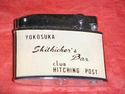 This is the reverse side of the same lighter showing Ships' Crest and the script "USS COLLETT DD-730". The third picture is of a lighter I got at one of the bars I hung out in Yokuska. It was the Hitching Post Bar, and I am sure I spent many a night there, while in port, working on some magnificent hangovers. The fourth is the reverse of the "Shitkicker Lighter" with a little cartoon sailor.
