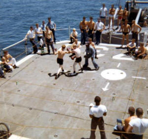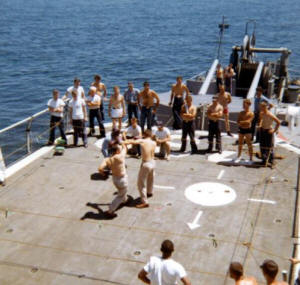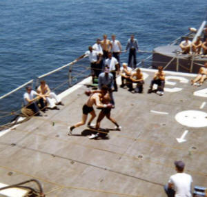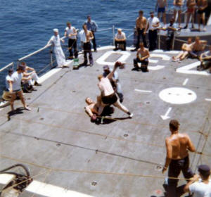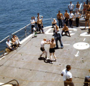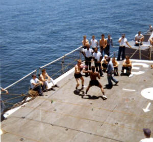 back on deck appears to be perfecting some form of 'Kick Boxing'"