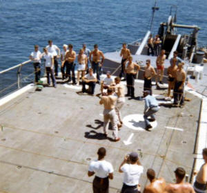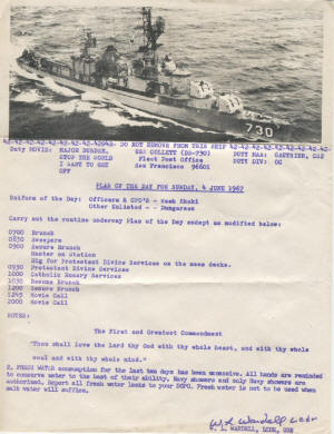 The plan of the day for Sunday, 4 June 1967 signed by LCDR Wardell, the XO (lovingly referred to as "Shakey Jake" by the crew). Movie was a double feature, Uniform of the day was Dungarees, so we were most likely out to sea, and it appears we were using too much fresh water. I do not recall the signifigance of the 42's across the top, under the ship's picture. This was mimeographed, state of the art stuff then, seems hard to imagine such pre-historic methods being used back then, what with all the computers and printers we have today.