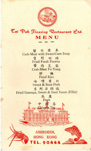 Honk Kong: Menu from Tai Pak in Aberdeen in 1967. |