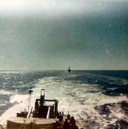Following my tour as First Lieutenant and Diving Officer on Spear, I went to the USS Opportune ARS-41 as Weapons, Deck and Salvage Officer. We made a Trans Atlantic tow on our way to the Med, did some mine ex's salvage work in the Med and Red Sea and had quite a trip. Here is one shot of our Atlantic tow in some good seas. 1981. |