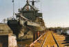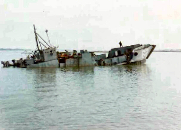 The pieces of the 78 and 1500 after they were blown up at Bridge Ramp in Danang...the stern of the 1500 is under the water by the stern of the 78 that can be seen out of the water. 1969. |