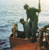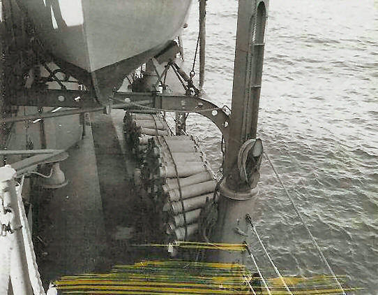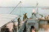 Here we are launching a 35' hawser handling boat in preps for laying a moor for diving and bell ops, 75-76. |