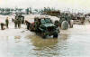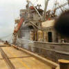 Marine truck that had been going up the Cua Viet River in an LCM-8 when it hit a mine and was blown out of the boat..divers hooked on to it and we lifted it out of the river and carried ti back to Cua Viet hanging on the A-frame across the front of the boat. 1969. |